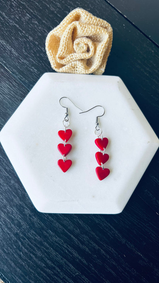 Christmas earrings Red hearts extra long statement earrings Tagua jewelry Xmas fashion Casual trendy drops Stocking stuffer Lightweight