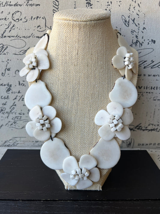 Ivory white flower statement necklace 14 wedding anniversary gift for wife Tagua jewelry Spring fashion 2025 Big bold chunky necklace