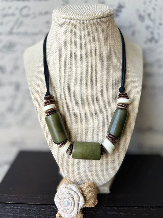 Olive green tagua necklace with coconut beads Lightweight and adjustable Multi color bib collar Xmas gift ideas Fall fashion style