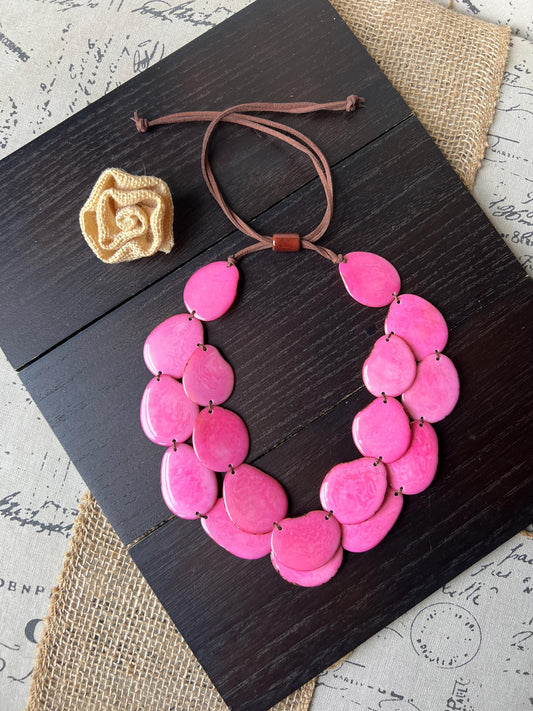 Pink statement necklace set Tagua nut jewelry Summer fashion trends Big bold chunky necklaces Anniversary gift for women leather Beach style