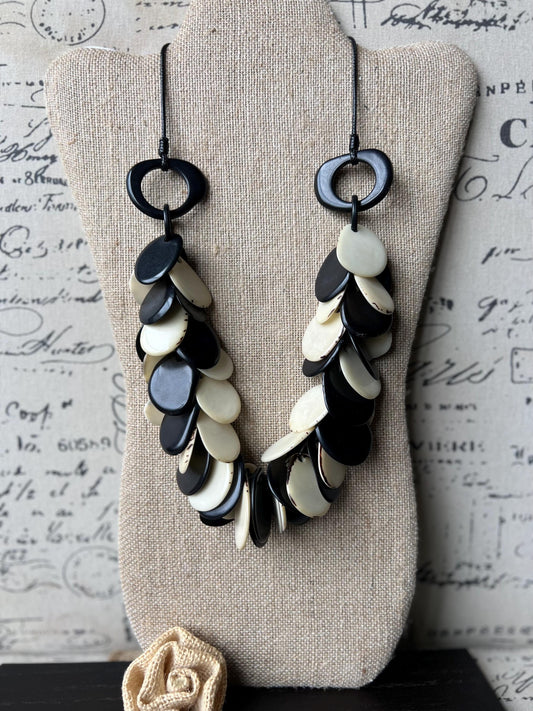 Black and white statement necklace Adjustable cord Tagua nut jewelry Artisan handmade Fall fashion Wearable art Simple bead necklace