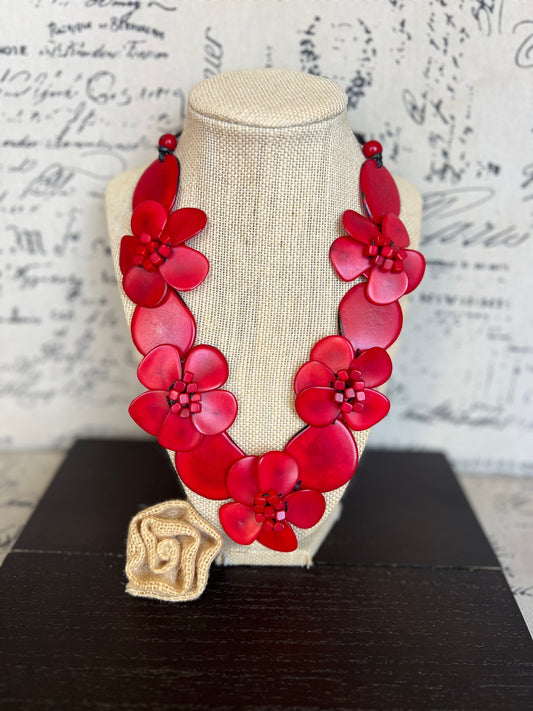Red flower statement necklace Tagua jewelry Mothers day gifts Big bold necklaces Wearable art Beaded necklaces Floral jewelry Red roses