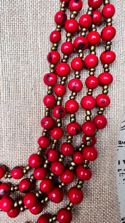 Red beaded statement necklace made with Acai seeds Multi layer necklace Wearable art