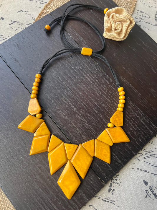 Yellow Tagua Nut Statement Necklace: Geometric Bib, Adjustable Cord