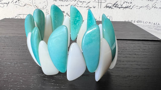 Turquoise green white beaded bracelet Stocking stuffers under 25 Tagua jewelry Multicolor stretch bangle Beach wedding trends Fall fashion