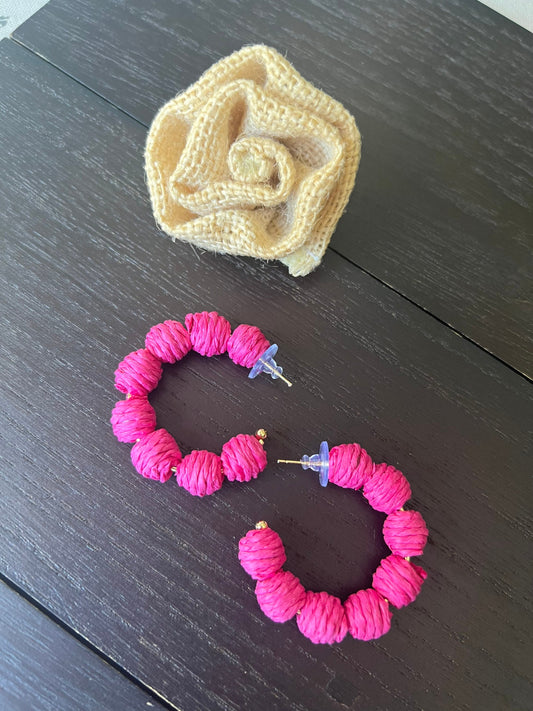 Pink hoop earrings Statement rafia earrings Anniversary gift for wife Artsy gifts Fall fashion Wearable art Cruise wear Beach outfit