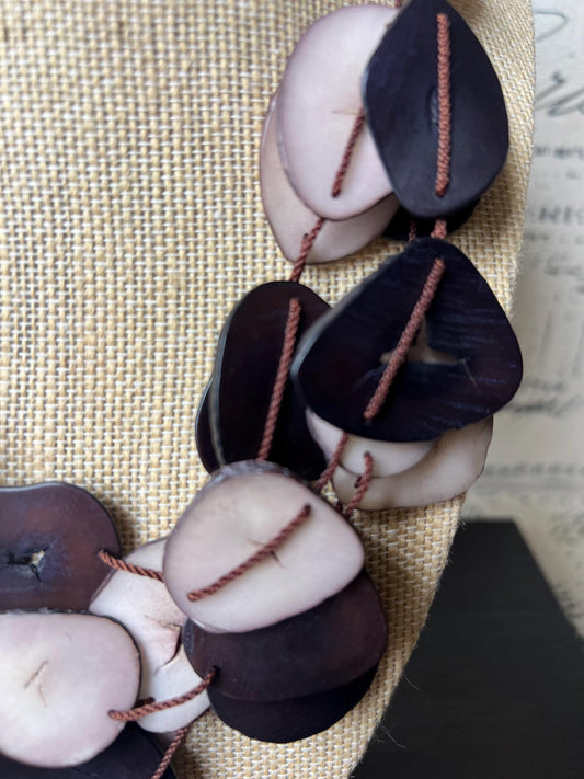 Brown and light mauve multi layer necklace Tagua jewelry Big bold necklaces Adjustable cord Triple strand statement necklace