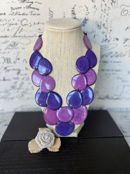 Purple Tagua Nut Statement Necklace, Adjustable Cord Chunky Jewelry, Wearable Art, Multi Layer Bib