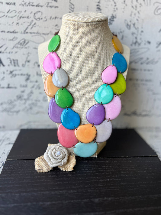 Rainbow statement necklace Tagua jewelry Big bold necklaces Wearable art Fall fashion 2025 Artsy gifts Multi layer necklace Adjustable cord