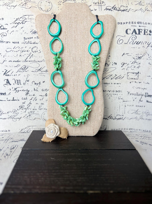 Turquoise green beaded necklace Tagua jewelry Fall fashion 2025 Fall fashion 2025s Statement bead necklace Lightweight jewelry Art to wear