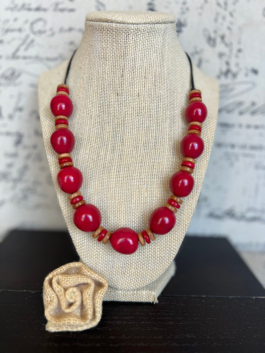 Red and brown statement necklace with bubblegum beads Tagua and bombona necklace Fall fashion Big bold chunky necklace Fall fashion 2025