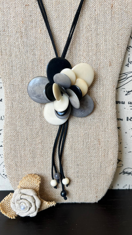 Flower pendant necklace Tagua jewelry Black white and gray flower pendant Floral statement necklace Adjustable cord Wearable art Lightweight