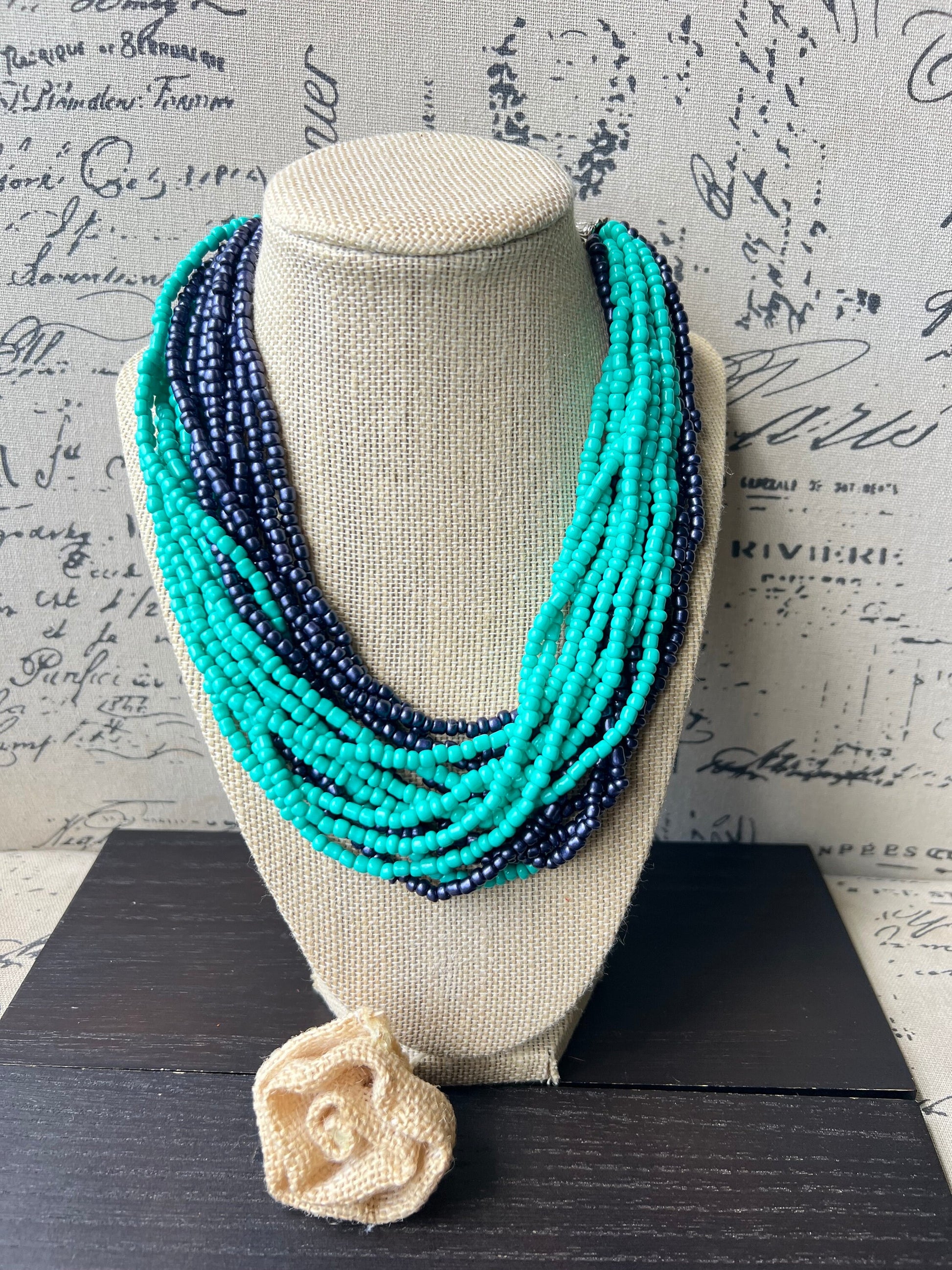 This stunning Eco friendly necklace is made of rice beads in blue and turquoise.