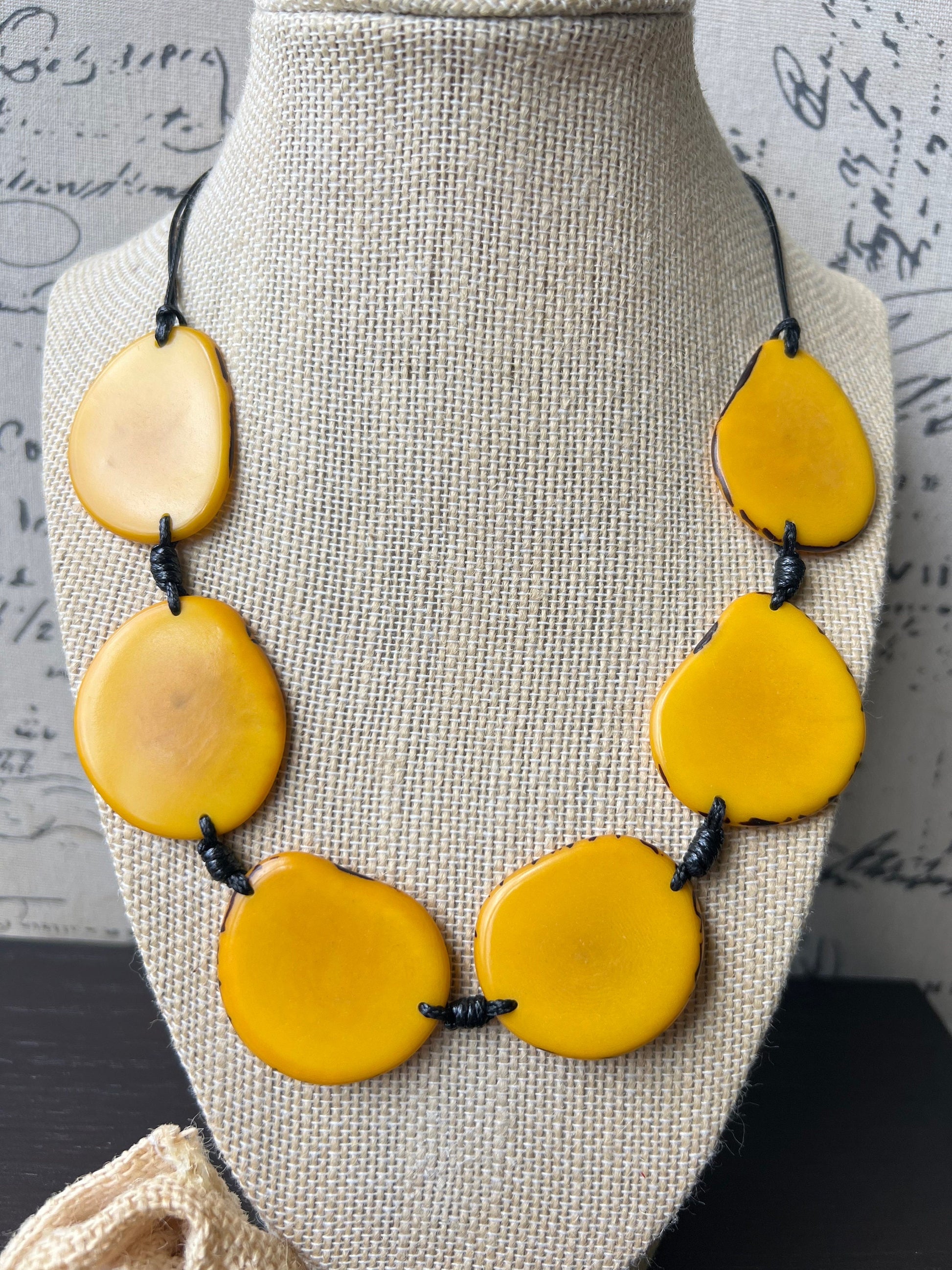 The Necklace has Tagua Slices that have been sewn together and held by waxed cotton straps.
